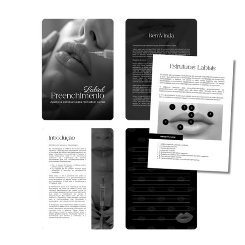 Com esta apostila editável de Preenchimento Labial, você terá em mãos um material completo, moderno e pronto para personalizar com sua identidade visual, cores, logotipo e fotos.